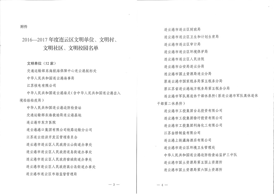 10月10日,中共連云區(qū)委、連云區(qū)人民政府發(fā)布《關于命名2016-2017年度連云區(qū)文明單位、文明村、文明社區(qū)、文明校園的決定》,我單位被授予“區(qū)文明單位”榮譽稱號。這是我單位精神文明創(chuàng)建工作的又一項豐碩成果。