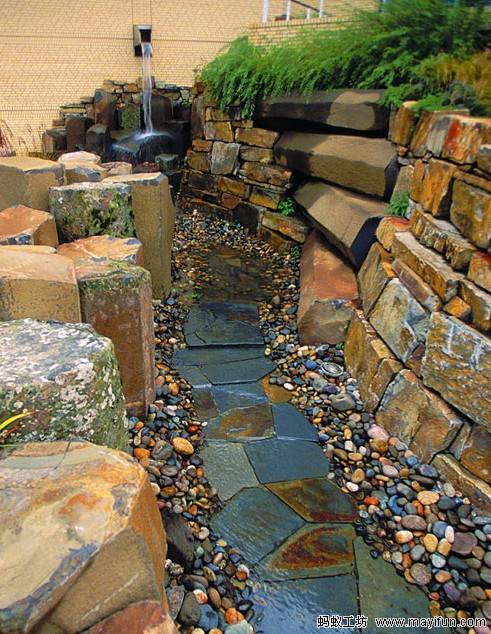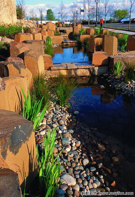 你也許會(huì)問,藝術(shù)在哪里?雨水打造的水體景觀的建筑表達(dá)方式是什么?優(yōu)秀的設(shè)計(jì)能否將雨水利用和運(yùn)用雨水本身所形成的融合建筑體驗(yàn)的“場所創(chuàng)造”聯(lián)系在一起?答案是肯定的。一些富有創(chuàng)造力的景觀設(shè)計(jì)師已經(jīng)發(fā)現(xiàn)雨水所蘊(yùn)含的藝術(shù)潛能。就像我上面說的一樣,關(guān)鍵是表達(dá)出雨水在整個(gè)設(shè)計(jì)中的獨(dú)特動(dòng)感之美。景觀設(shè)計(jì)師史蒂夫·科赫為波特蘭的一座公寓設(shè)計(jì)的庭院景觀就是一個(gè)典范。科赫的設(shè)計(jì)將屋頂雨水收集起來,水流在高低錯(cuò)落的水道中歡快地跳躍著,最后注入巖石圍筑的水池。水池下是一個(gè)用于收集雨水的蓄水池。值得注意的是科赫的這個(gè)成功作品還借鑒了印度傳統(tǒng)的建筑圖騰。景觀設(shè)計(jì)師在利用雨水打造水體景觀時(shí),要充分學(xué)習(xí)當(dāng)?shù)貍鹘y(tǒng)文化,將其有效地運(yùn)用到設(shè)計(jì)中。