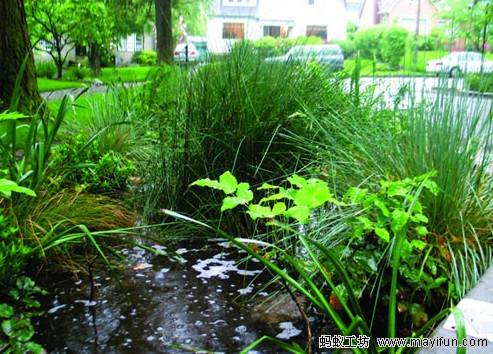 停車場地面上的雨水沒有流入傳統(tǒng)的雨水排放系統(tǒng),而是通過“雨水花園”收集到名為“生態(tài)池”的專門排水系統(tǒng)中,收集到的雨水用于澆灌植被、滋潤土壤或補(bǔ)充地下水。由于“雨水花園”將雨水收集起來,因此特別是在降雨量大、城市排水系統(tǒng)超負(fù)荷運(yùn)轉(zhuǎn)的情況下,它們有效地減輕了城市排水系統(tǒng)的壓力。只有在降雨量非常大的時(shí)候,“雨水花園”才需要另辟一條溢流管將多余的雨水排入城市雨水排放系統(tǒng)中。