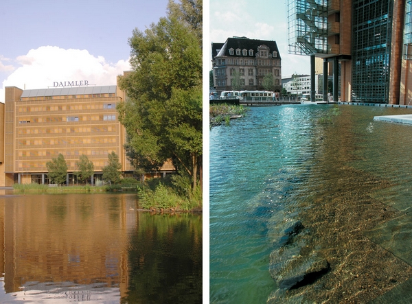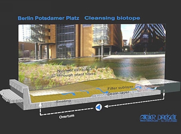 這一城市水景設(shè)計(jì)之中蘊(yùn)含的理念即為,雨水在降落之地即應(yīng)被就地使用。在波茨坦廣場,綠化屋頂和非綠化屋頂?shù)慕Y(jié)合設(shè)計(jì)可以獲取全年降雨量。雨水從建筑屋頂流下,作為沖廁、灌溉和消防用水。過量的雨水則可以流入戶外水景的水池和水渠之中,為城市生活增色添彩。