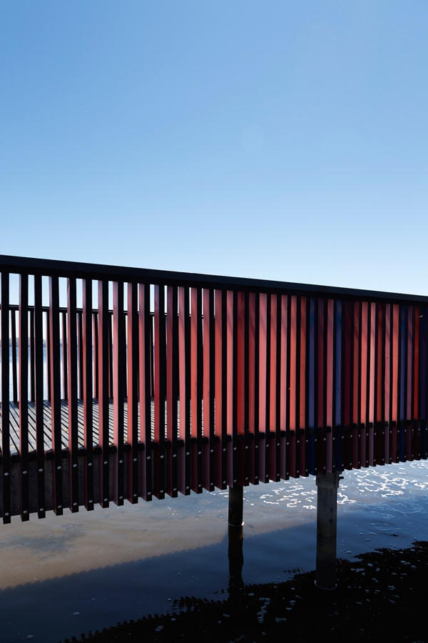 表面由窄木條鋪設(shè)而成,棧道上面的木欄桿則被漆成鮮艷的顏色來形成一種條紋狀圖案。兩個木結(jié)構(gòu)