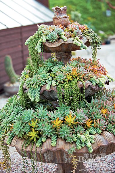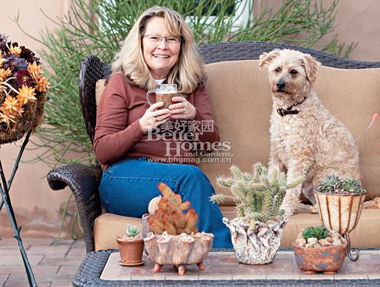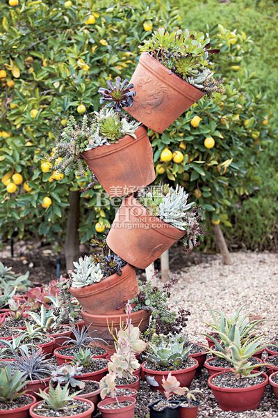 Jeanne也喜歡自己組多肉植物盆栽,常用到的素材是墨西哥景天,比如新玉綴、金色的銘月,它們的葉片只有子彈大小,但是沒有它們的歐洲替代品種那么耐寒。通常,這些歐洲的替代品種的葉片會(huì)更袖珍。在有花園聚會(huì)或朋友到訪的時(shí)候,Barry會(huì)開著車接送客人駛過花園中悠長(zhǎng)而陡峭的車道,沿途人們看到他們豐盛的多肉植物花園,第一反應(yīng)就是回去自己也要設(shè)計(jì)一個(gè)同樣的花園,鏟除原來(lái)花園里的草坪,甚至還有些朋友強(qiáng)烈要求下次帶自己的花園設(shè)計(jì)師過來(lái)取經(jīng)。這個(gè)用多肉植物和仙人掌組成的低水需花園已經(jīng)是周圍人紛紛效仿的典范。