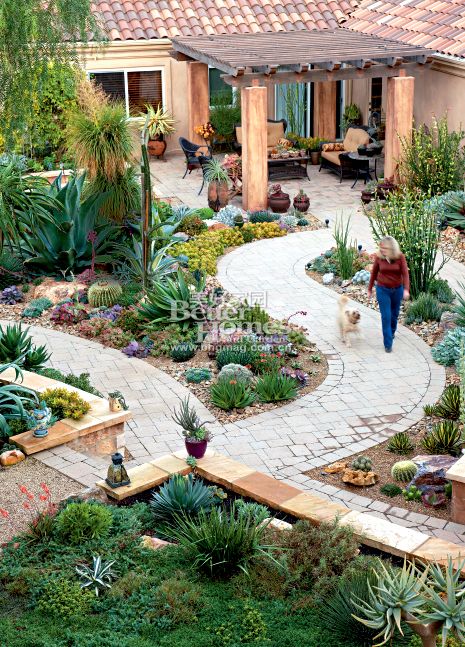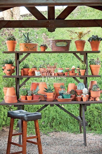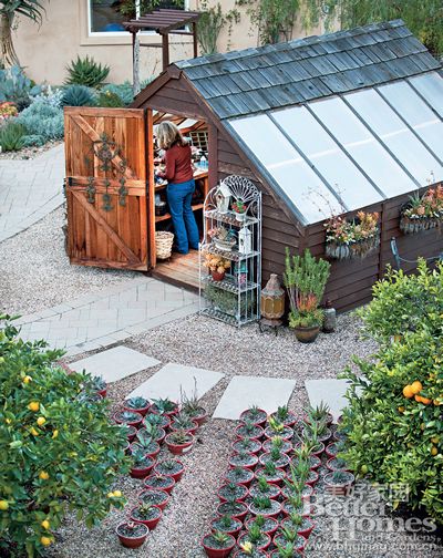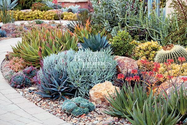 花園工具房里存放著整碗的彩色碎玻璃,它們是Jeanne用來(lái)裝飾盆栽的,透過天窗的光線閃閃發(fā)光。附近的小木屋則用來(lái)庇護(hù)她的植物和繁殖新的幼苗,根據(jù)季節(jié)Jeanne會(huì)從高抬花床收獲到沙拉菜、番茄、南瓜、草莓和十幾種香草。夏天,她喜歡用綠薄荷的葉和冰水調(diào)制飲料。盡管蔬菜花園里的作物看起來(lái)與外邊的多肉植物、仙人掌風(fēng)格相差甚遠(yuǎn),但它們的位置集中在幾處島狀的區(qū)域,通過的重復(fù)景觀的手法,讓它們看起來(lái)不那么突兀。從視覺的角度說(shuō),也促進(jìn)了房子與花園中黃褐色的灰泥矮墻之間的協(xié)調(diào)問題。雖然花園的設(shè)計(jì)是以耐干旱為主題,這并不意味著花園沒有完善的灌溉系統(tǒng)。畢竟南加利福尼亞州有時(shí)會(huì)出現(xiàn)幾個(gè)月無(wú)降雨的情況,此時(shí)就需要灌溉系統(tǒng)登場(chǎng)。多肉植物雖不像養(yǎng)護(hù)草坪、玫瑰或一年生植物那樣費(fèi)水,但常規(guī)的給水會(huì)讓它們有最出色的表現(xiàn)。
