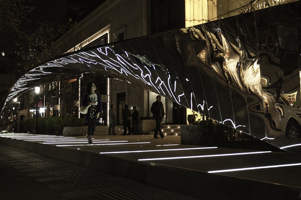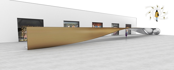這個30米長的公共裝置是一整塊造型扭曲反轉(zhuǎn)的板,墻會自然過渡為天花,路過行人的身影會被反射。Ben van Berkel說他們希望將這個裝置做成裝扮公共空間的一個焦點,能夠吸引周圍的公共,人們路過這里就像是在走秀,在這里看自己也看別人,看與被看發(fā)生嶄新的關(guān)系,并產(chǎn)生一種全新的理解周圍觀點的方式。