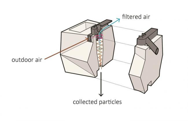 會(huì)呼吸的磚將被用于建筑正常通風(fēng)系統(tǒng)的一部分, 它是一種雙層磚結(jié)構(gòu),外部精制磚輔以可提供標(biāo)準(zhǔn)絕緣的內(nèi)層結(jié)構(gòu)。呼吸磚的設(shè)計(jì)概念是旋風(fēng)過濾, 一個(gè)來(lái)自現(xiàn)代真空吸塵器的理念。